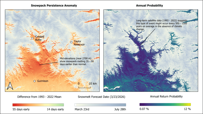 When accounting for recent climate change, which has caused snowpack to melt 3 to 5 days earlier each decade since 1993 at many sites, the likelihood of this year’s low snowpack level increases. However, it is still rare, with an estimated chance of occurring just once in 25 to 50 years. Moreover, at mid-elevations (between 8,000 and 9,000 feet), low snowfall and warm temperatures have combined to completely melt the current year’s snowpack 35 to 50 days earlier than the historical average. Although storms this week are bringing significant new snow to the higher peaks in the Gunnison Basin, sites where snowpack has already disappeared (most sites below 9,000 feet elevation) will receive mostly rain from this event.